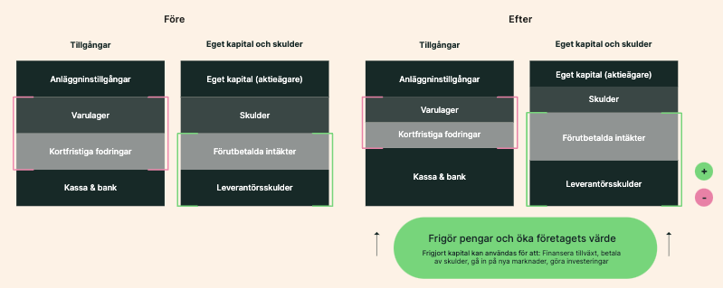 Att optimera rörelsekapitalet frigör kapital till bolagets kassa. Pengar som annars varit bundna i för tidigt betalade leverantörsfakturor, utestående kundfakturor eller överlager.
